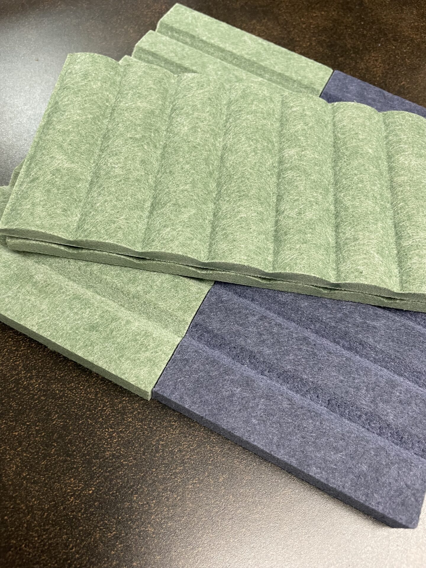 These oversized edge to edge panels provide an ideal decorative, dimensional and acoustic surface. They are made of 100% hot pressed polyester fiber. Available in broad range of varied colors, different perspectives, this premium solution is suitable for controlling reverberated noise and can be applied over additional absorptive insulation to create the level of absorption you require or over a mass loaded vinyl membrane to break the flow of noise waves room to room. eKōR Acoustic Architectural material is so highly fluid in its many shapes colors and forms that it has revolutionized the way that to envision new ways to integrate architecturally acoustic solutions for design.